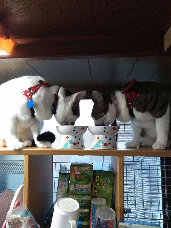 大きい方が良いと思いウオーターボウル、パウチや缶詰は脚付きレギュラーサイズを使っていたのですが、