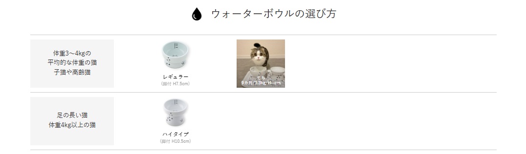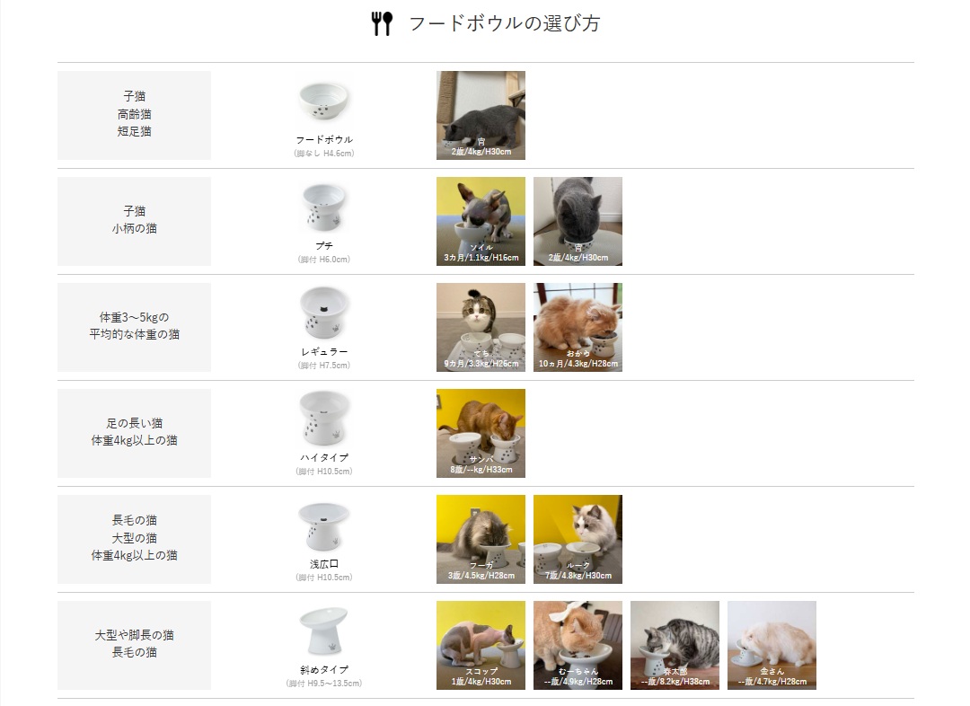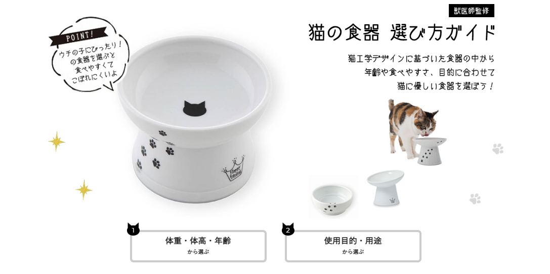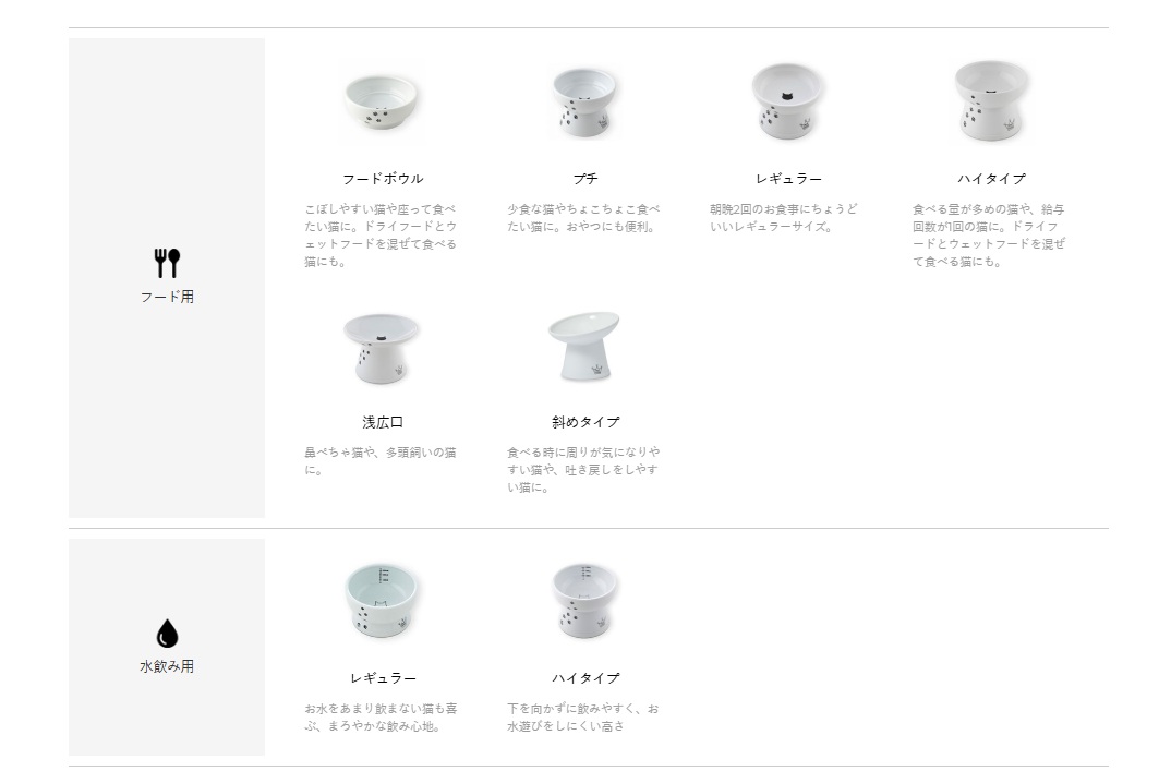 「目的や用途で食器を選ぶ」という方法も、食器の絞り込みには有効です。猫壱の食器は、フード用と水飲み用にわかれています。以下の表を見ながら、用途に合った食器を探しましょう。