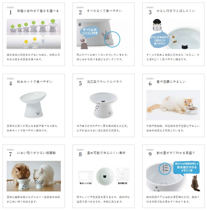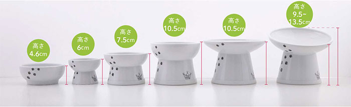 Q:猫が食べにくそう、飲み込みにくそうなのはなぜですか? A:猫は狩った獲物を食べる際、腹ばいになって食べる食性があります。地面に近く低い食器を使いながら立ったままで食べようとすることで、食道や腹部が圧迫されることにより、嚥下(えんげ = 飲み込むこと)がしにくくなったり、必要以上の空気を一緒に飲んでしまうことでお腹が膨れて不快感に繋がることがあります。首からお腹にかけてなだらかな姿勢で食べることが出来る、猫の体高・体型に合わせた食器を選ぶことにより、身体に負担をかけずに、食を楽しむことが出来ます。