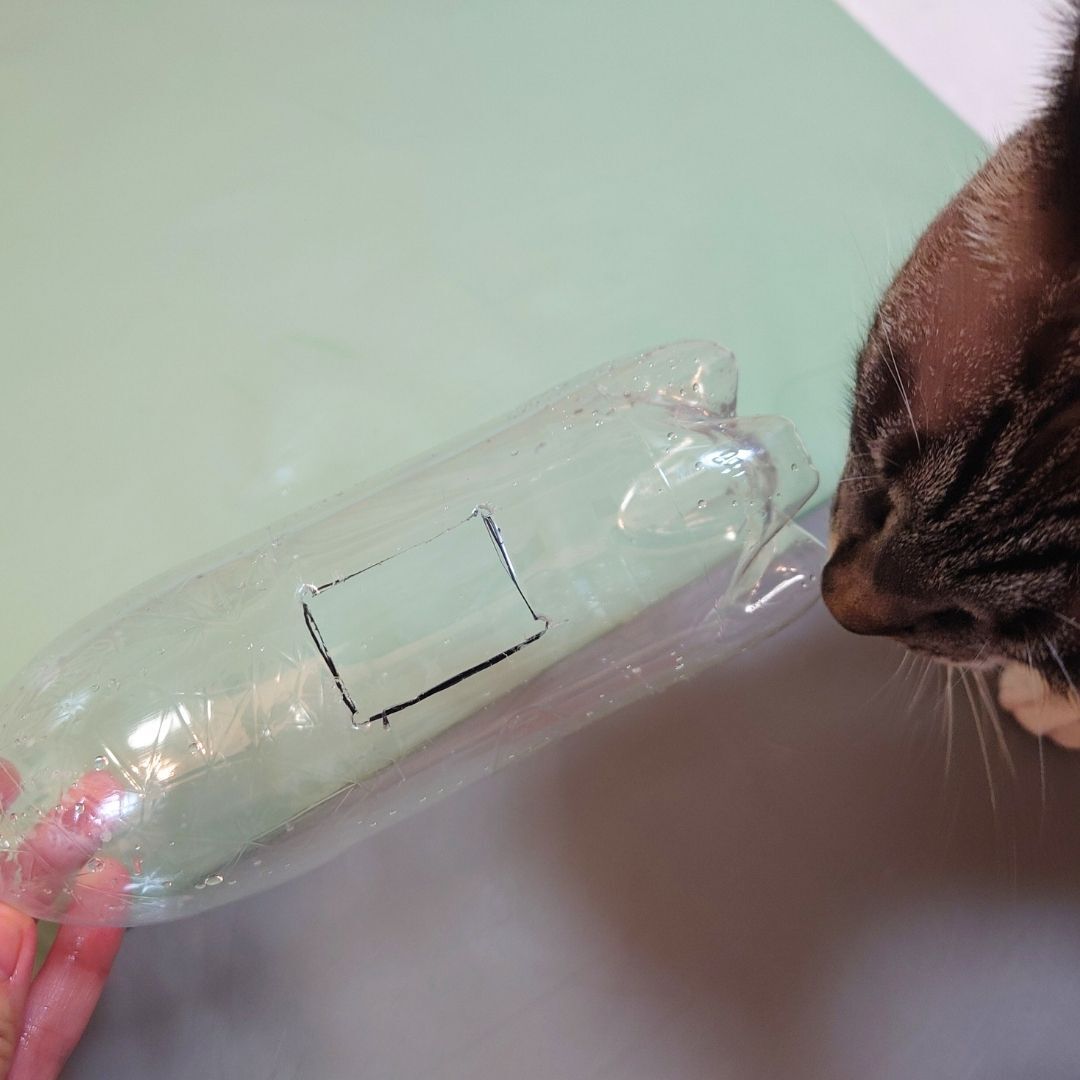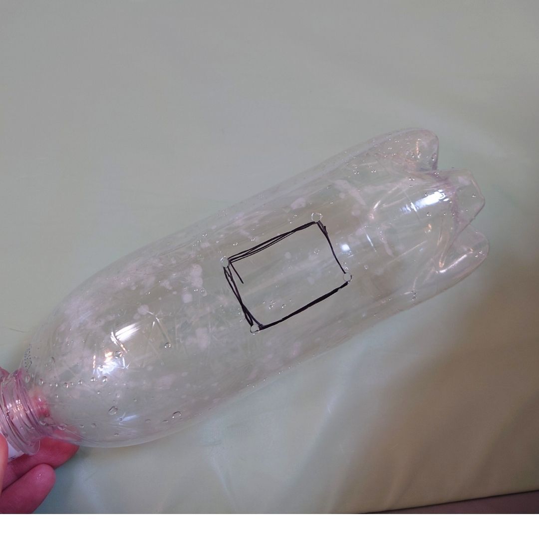 ①空のペットボトルをよく洗い、乾かします。②穴を開ける位置を決めます。必要に応じてペンでマーキングを。