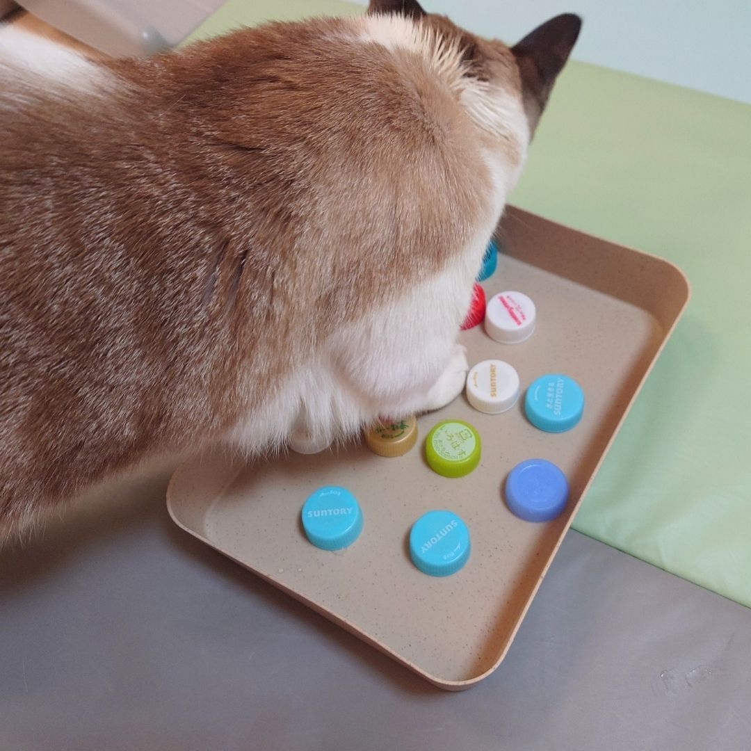 ③キャップの中や、裏におやつを隠したり、たくさんいれたキャップの山の中におやつを隠したり…