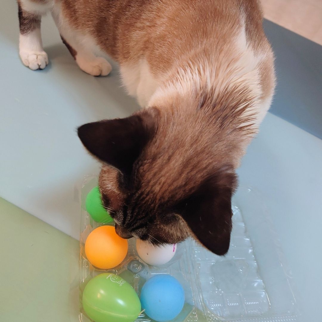 ①(プラスチックの場合)たまごの空きパックをキレイに洗い、よく乾かします。②たまごが入る部分や、蓋など、猫ちゃんの熟練度に合った場所に、お気に入りのおやつやごはんをいれます。