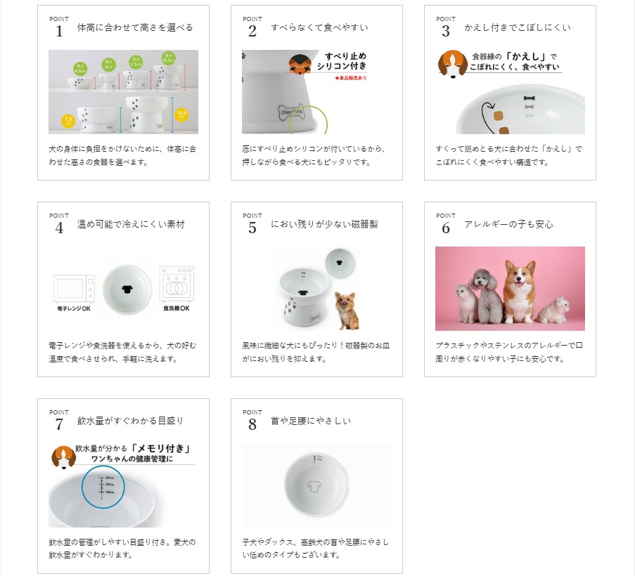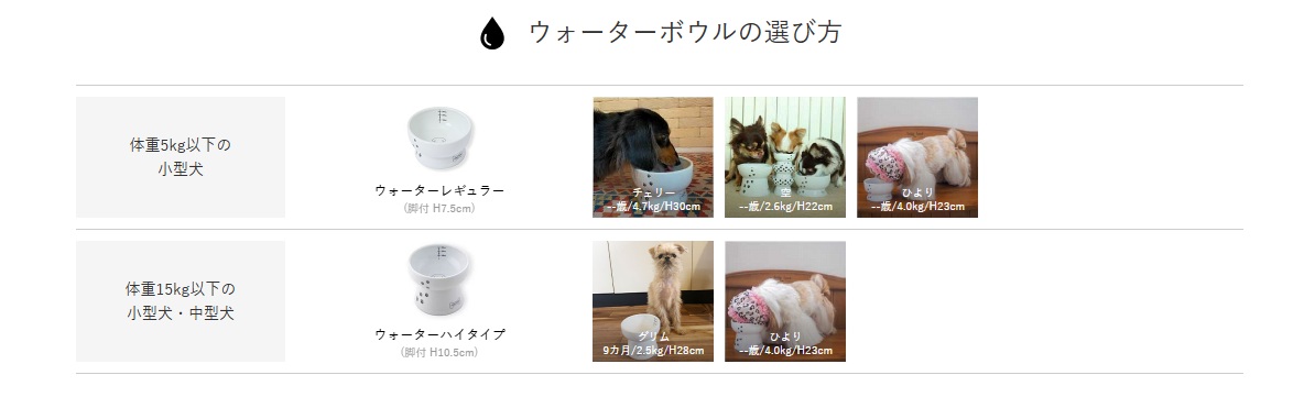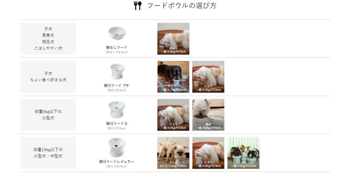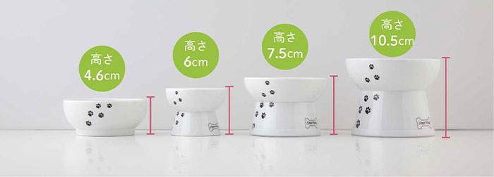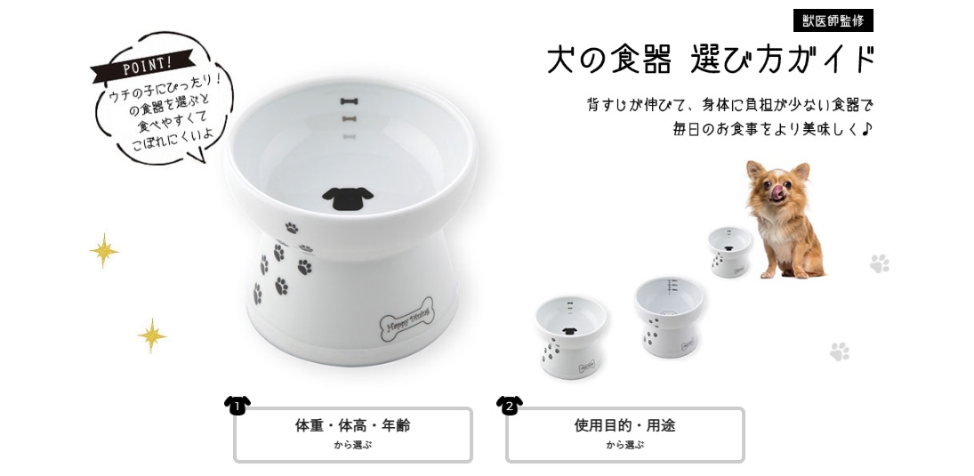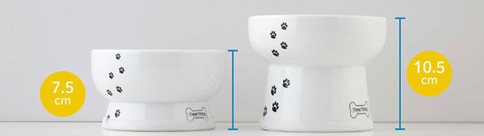 A:特に高齢犬や嚥下が上手ではない犬の場合、首を曲げたままドライフードなどの硬いフードが食べにくかったり、吐き戻しをしてしまったりする場合があります。地面に近く低い食器を使いながら立ったままで食べようとすることで、食道や腹部が圧迫されることにより、嚥下(えんげ = 飲み込むこと)がしにくくなったり、必要以上の空気を一緒に飲んでしまうことでお腹が膨れて不快感に繋がる、消化吸収うに影響が出ることもあります。首からお腹にかけてなだらかな姿勢で食べることが出来る、犬の体高・体型に合わせた食器を選ぶことにより、関節や身体全体に負担をかけずに、食を楽しむことが出来るのでオススメです。