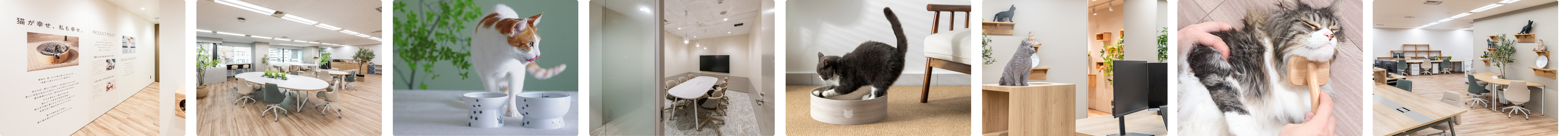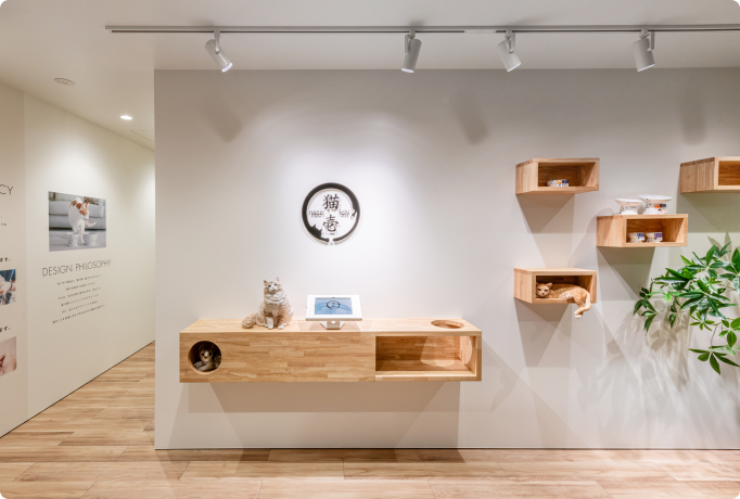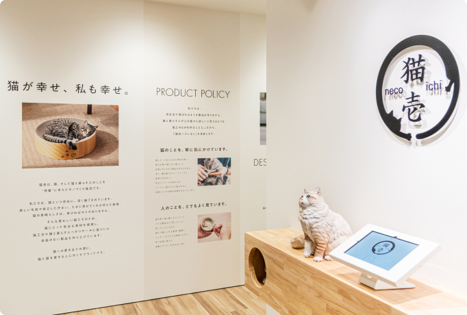 ドアを開けると、可愛い猫ちゃんたちがお出迎えしてくれます。お客様や採用候補者の方へのブランド紹介として、この空間で猫壱のお話をすることも。
