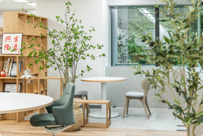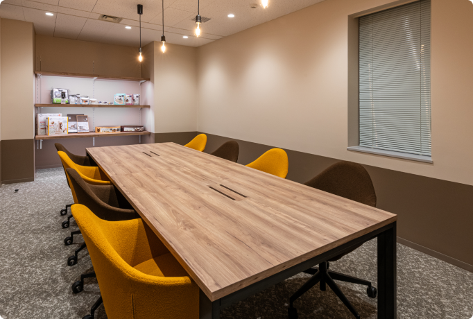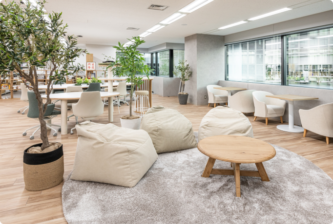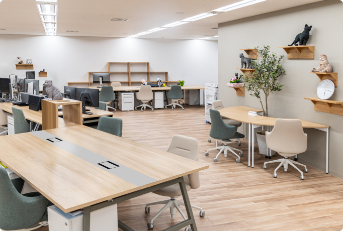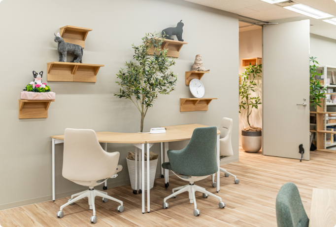 フリーアドレス席も一部備え、モニターや十分な収納も完備。猫と人が暮らす穏やかな住空間をイメージし、いつも猫のことを心に留めながら働けます。