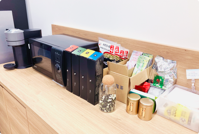 水/緑茶/コーヒーはもちろん、紅茶や味噌汁まで楽しめる多種多様なドリンクコーナー。手軽に軽食を購入できるサービスも導入し、ほっと一息つける環境を整えています。