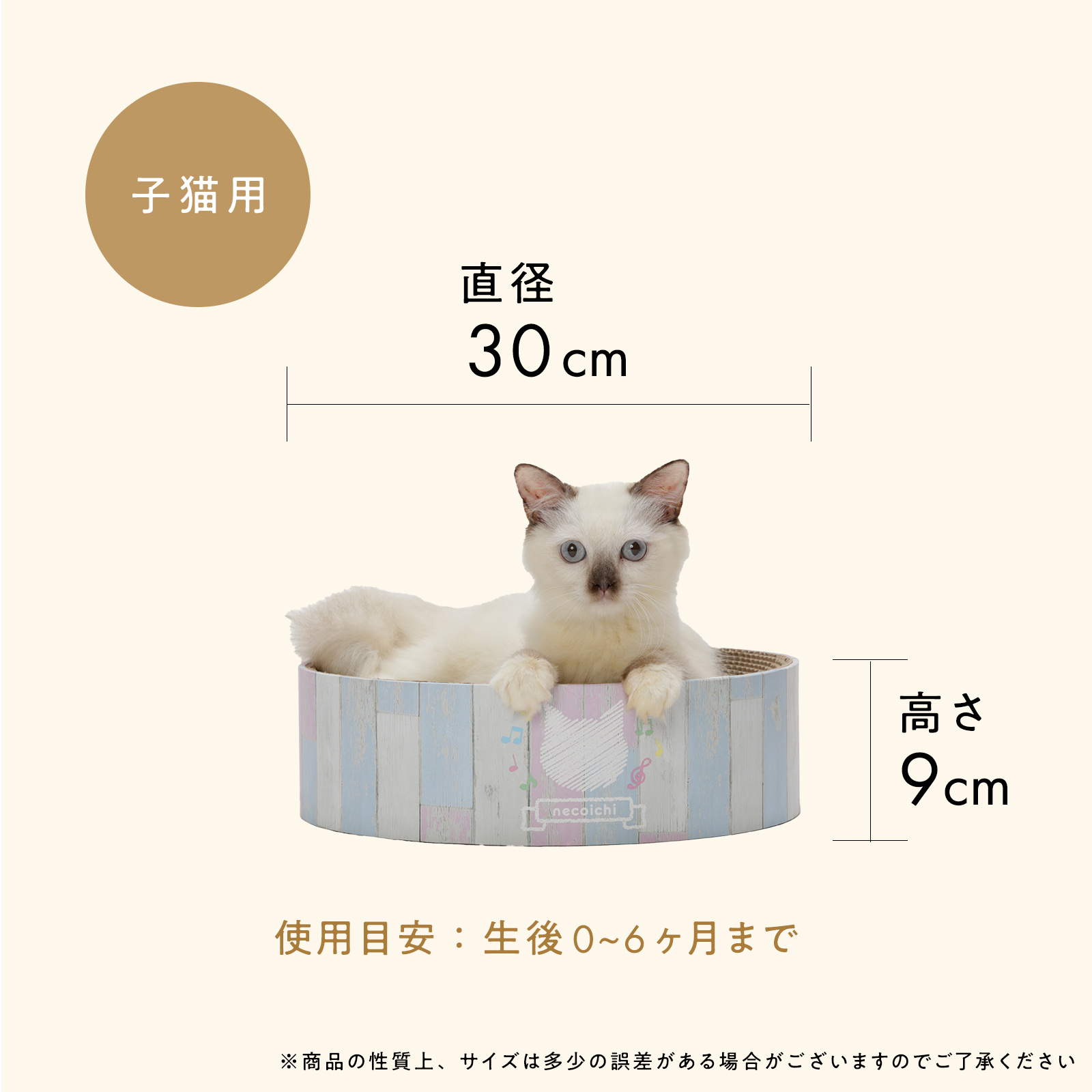 直径30cm、高さ10cm。子猫でも登りやすく、安心して使えるサイズ感にこだわりました。生後2ヶ月頃からのファースト爪とぎに最適です。