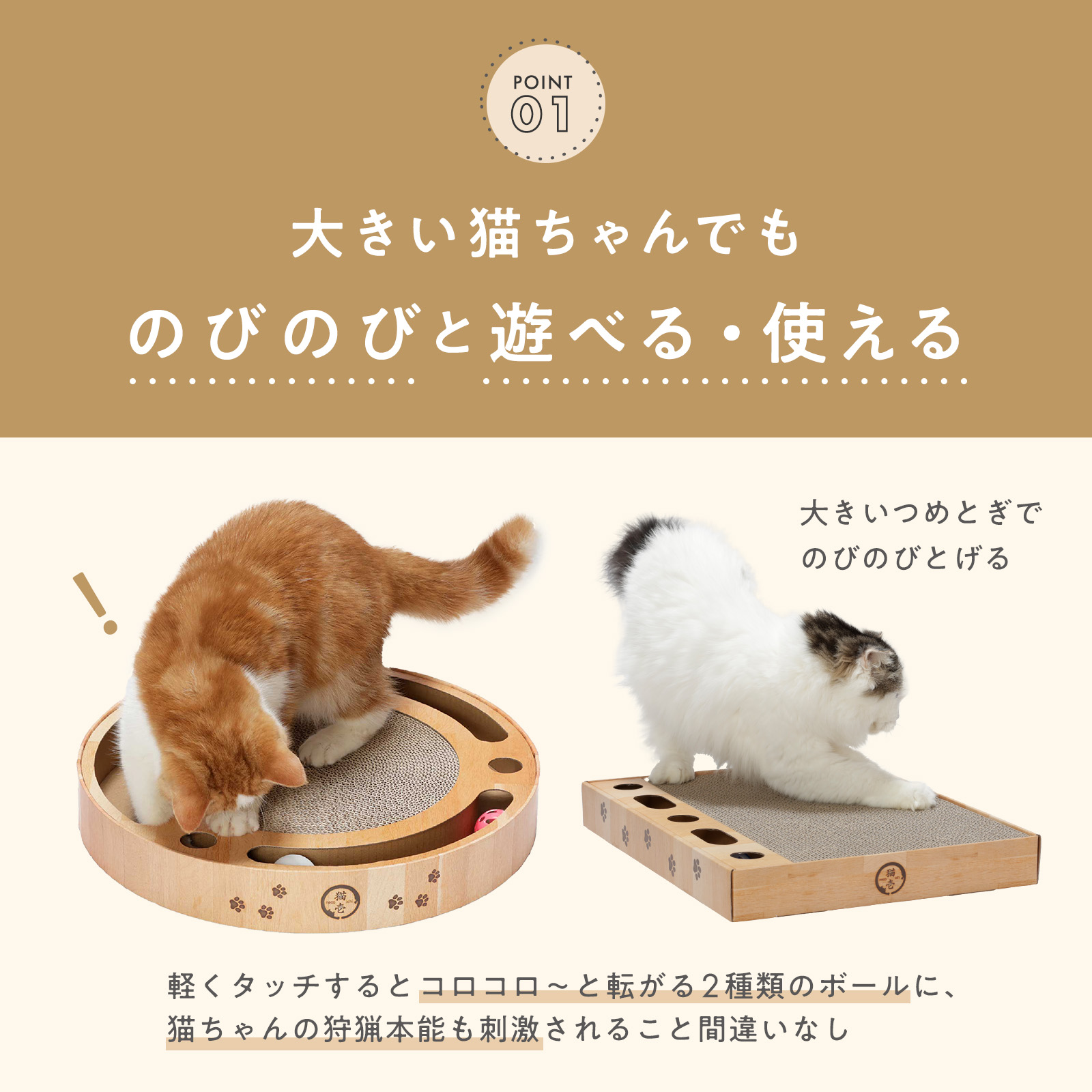 直線レールにボールと鈴ボールの2種類が入っており、音と動きで猫の狩猟本能を刺激します。爪とぎとしても使えますので、遊べる爪とぎとして最適です。