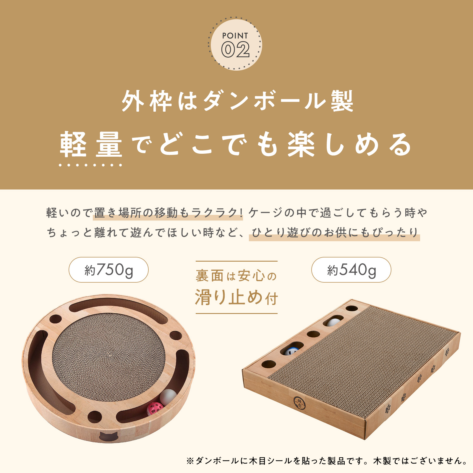ダンボールの原料は高品質なニュージーランド産の原パルプを一部使用し、貼り合わせには植物由来の糊を使用しています。猫がとぎやすく通気性も良い、つめとぎに最適な品質にこだわりました。