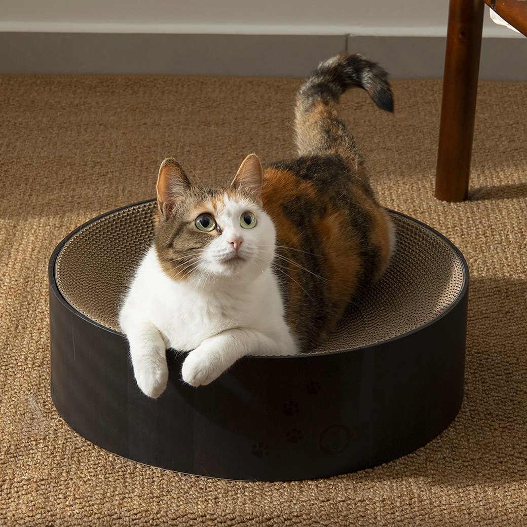 【猫の体にフィットするすり鉢構造】 薄いダンボールを幾重にも重ねて作ったすり鉢状のベッドが、猫の柔らかな体に吸い付くようにフィット。一度入ると出られなくなるほどの心地よさです。