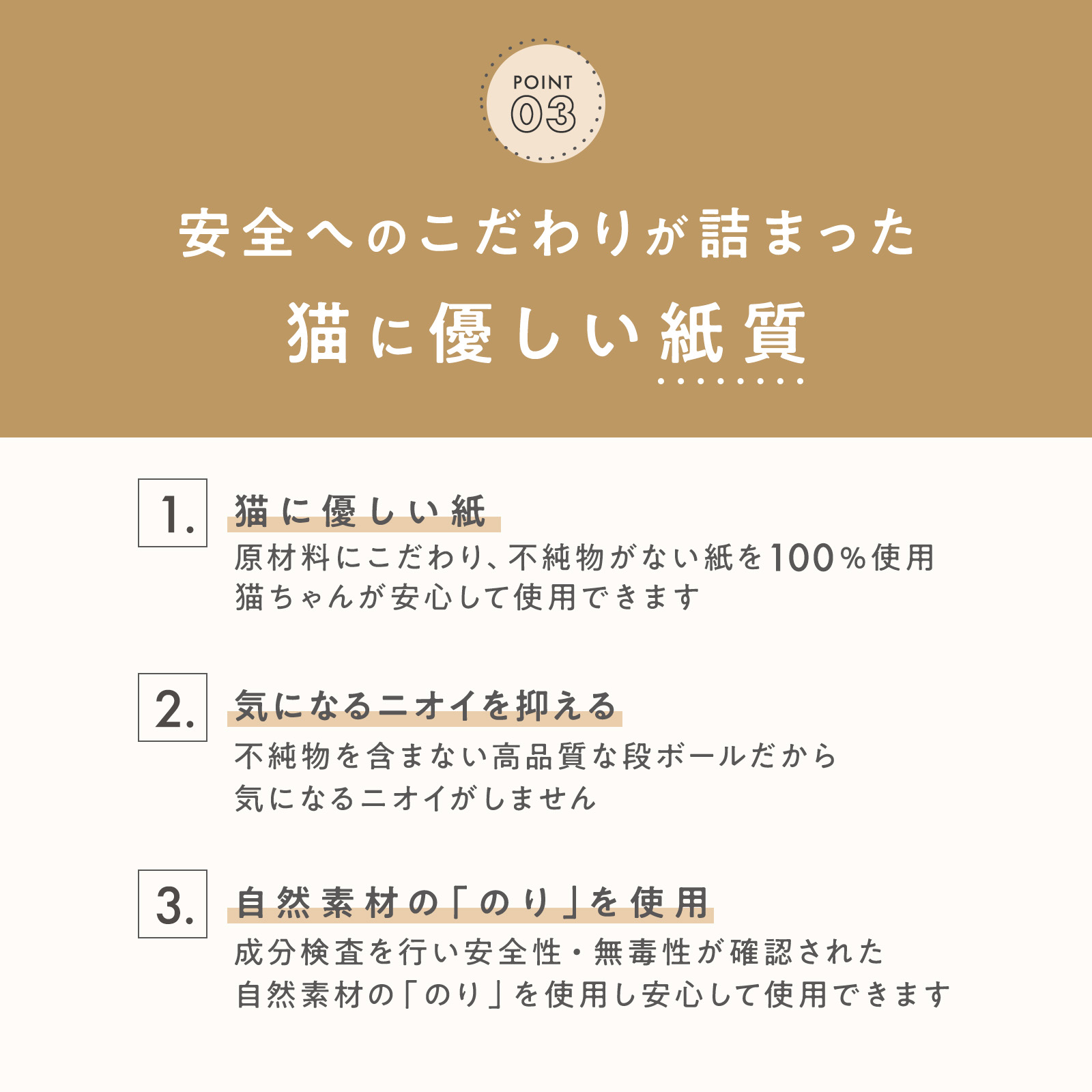 ダンボールの原料は高品質なニュージーランド産の原パルプを一部使用し、貼り合わせには植物由来の糊を使用しています。猫がとぎやすく通気性も良い、爪とぎに最適な品質にこだわりました。