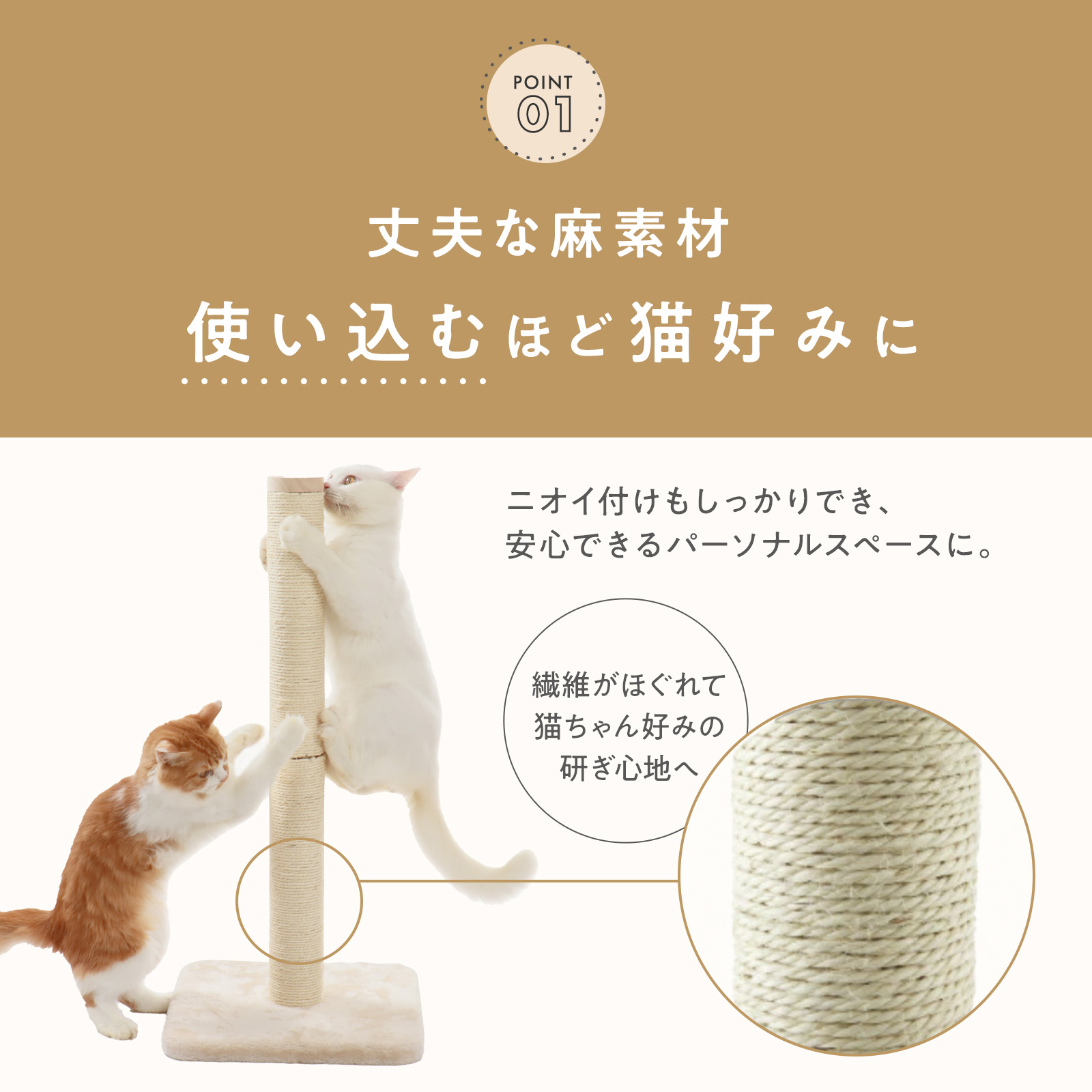 麻:丈夫な麻素材は、使い込むほどに繊維がほぐれて柔らかくなり、猫好みの研ぎ心地へと変化します。ニオイ付けもしっかりでき、安心できるパーソナルスペースになります。
