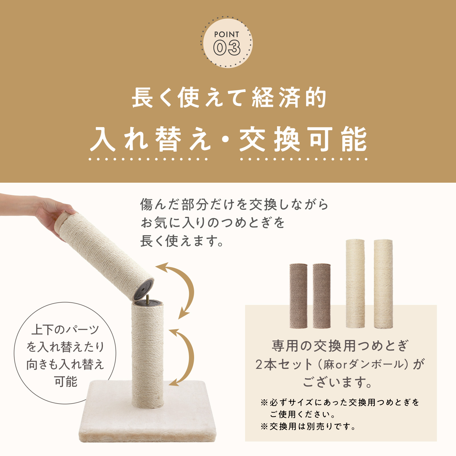 ベースはそのままにポールだけ交換できるので、お気に入りの爪とぎを長く使えます。