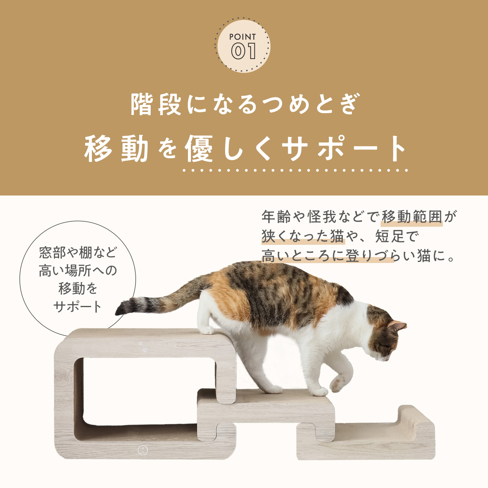 年を重ねるごとに訪れる関節や筋肉の不調によって移動範囲がせまくなった猫に寄り添う3段ステップ。