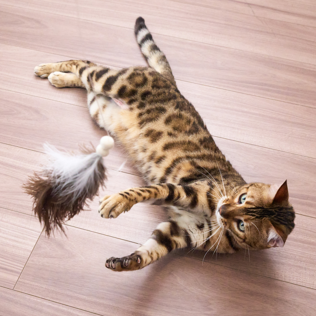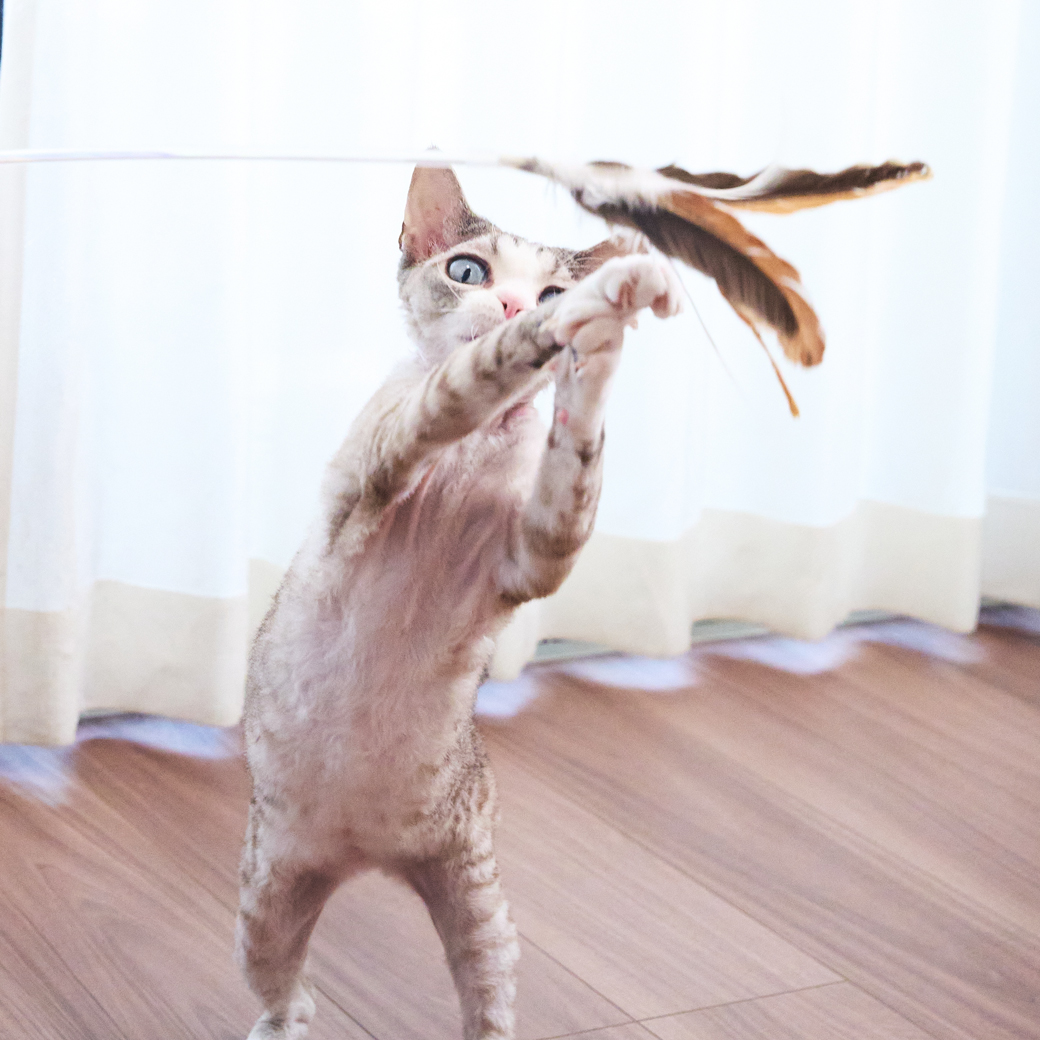 【天然羽根のリアルな動き】 ふわふわの天然羽根を使用することで、不規則で予測不能な動きを実現。まるで本物の鳥を追っているかのような感覚が、猫ちゃんの野生の本能を呼び覚まします。