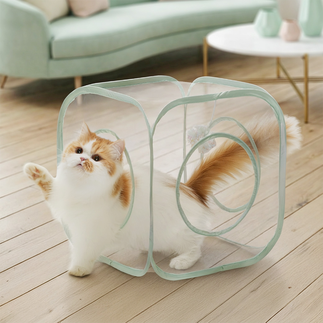 肉球もお腹も丸見え!猫も飼い主も楽しい「スケルトン」キューブ。