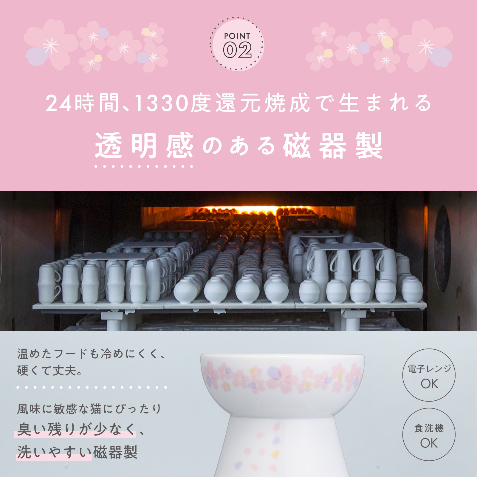 春の訪れを感じさせる桜の模様が、猫との食事の時間を華やかに彩ります。