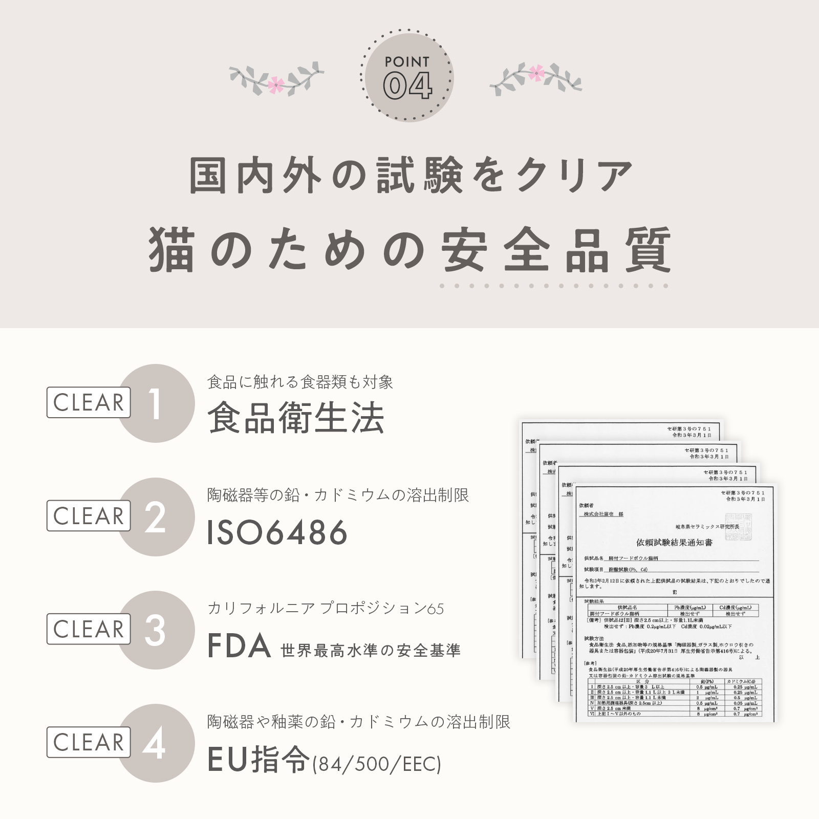 猫は食道が比較的まっすぐな動物です。低い位置での食事は逆流を招きやすいもの。頭と喉を下げずに自然な体勢で食事ができるため、嚥下を助け、一気食いによる嘔吐や吐き戻しの負担を軽減します。