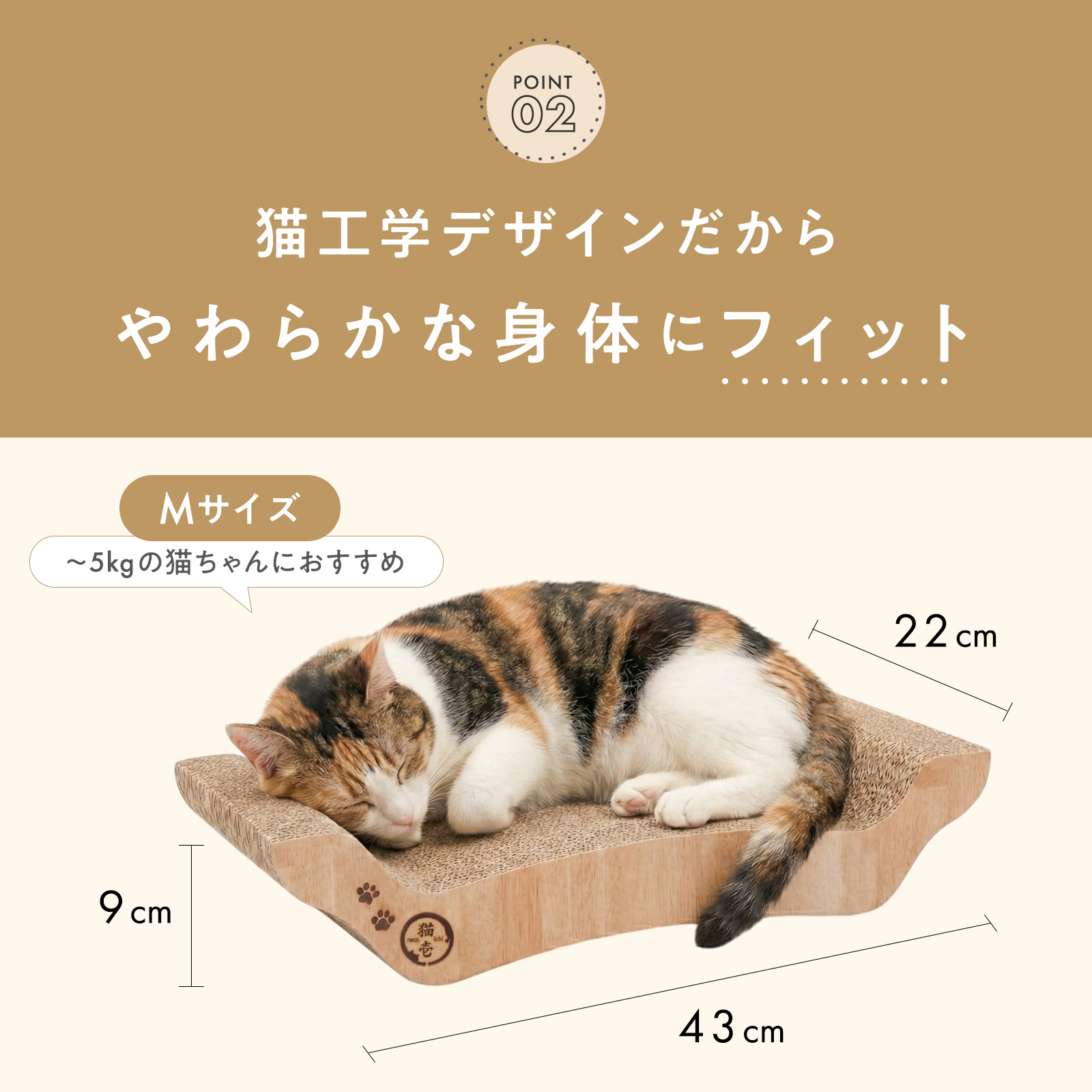 絶妙なカーブ形状が猫のやわらかい体にフィット。爪とぎとしてはもちろん、リラックスできるベッドとしても大活躍します。